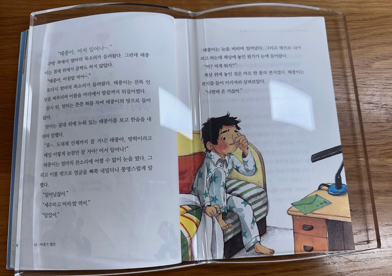 아이에게 독서 습관을 길러주고 싶을 땐 읽어라는 말보다 읽게 되는 환경을 먼저 만들어주는 것이 좋더라고요. 책상에서 숙제처럼 읽는 책이 아니라 식탁 위에서 흥미롭게 마주치는 책! 첫 문장을 읽고 어느새 페이지를 넘기고 있는 아이의 모습을 자주보았는데요, 그 시작을 아크릴 북 문진과 함께 했네요.^^